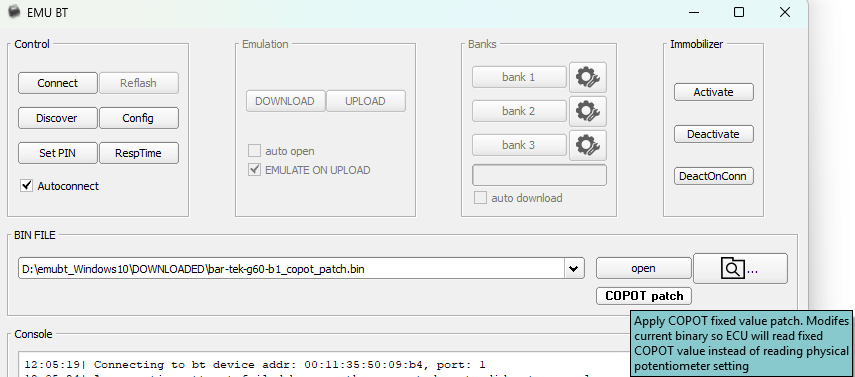 The emulator board and Windows application are continuously improved. Firmware updates can be applied using the REFLASH button. Ensure you use a compatible version of EMUBT.exe with the firmware. The latest versions can be found in the Download section.